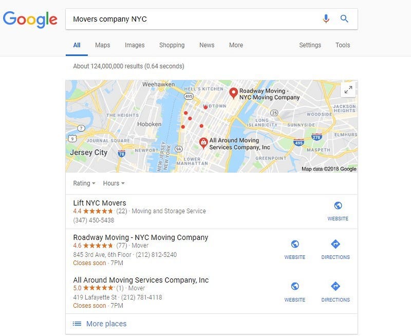 Instead, your Google search for “Movers Company NYC” will show a map with pinned locations of nearby Moving Company, below which will be descriptions of each Moving Company and a link to each Moving Google My Business listing. The most popular Moving Company will be the top three listed in the Google search results.