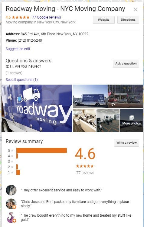 To capitalize on this, the Movers company in your town will have claimed or added their business information to Google Maps using Google My Business. For example, here’s how a local Roadway Moving listing looks when it shows up in Google Maps results: This listing has everything customers need to hire service from the local Roadway Moving: location, hours of operation, busy times, and customer reviews.